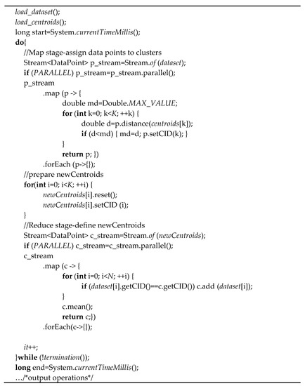 Figure 4 depicts the main part of the K-Means solution based on streams which can execute either serially or in parallel. The two modes are controlled by a global Boolean parameter which can be or . The algorithm first loads the dataset and the initial centroids onto two global arrays of data points (of a class ), respectively and of length and , from which corresponding (possibly parallel) streams are built.