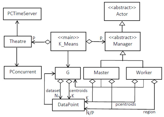 The simplified UML diagram of Figure 5 shows some developed Java classes for supporting Parallel (but also serial) K-Means using Theatre.