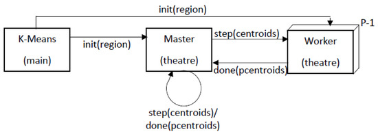 As indicated in Figure 5, and also shown by the message exchanges abstracted in Figure 6, the Theatre based K-Means adopts a master/worker organization (see later in this section for further details).