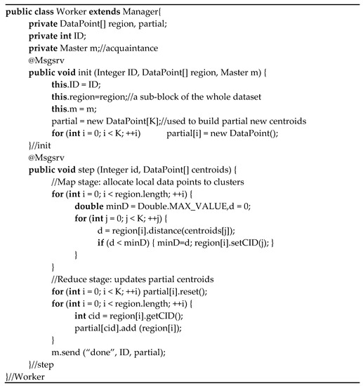 The method of the class (see Figure 7) instantiates theatres, each one equipped with an instance of and one of . The method of the master theatre is redefined for completing the parallel configuration. Manager actors are created, one of the type and of the type. Such actors are moved to separate theatres. For brevity, Figure 8 shows only the actor class. Each manager understands the basic message (see the message server in Figure 8), introduced by the base abstract class. As a rule, every programmer-defined actor class is initialized by an explicit message (see also Figure 6), whose parameter list is tuned to the specific task/role assigned to the actor. The of receives the master ID, the assigned subblock of the dataset, the initial values of the centroids and the array of all the manager references (acquaintances). The of , instead, receives (see Figure 8) its unique ID, the assigned subblock of the dataset, and the reference to the manager.