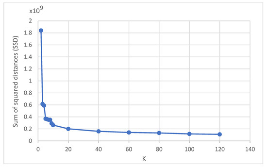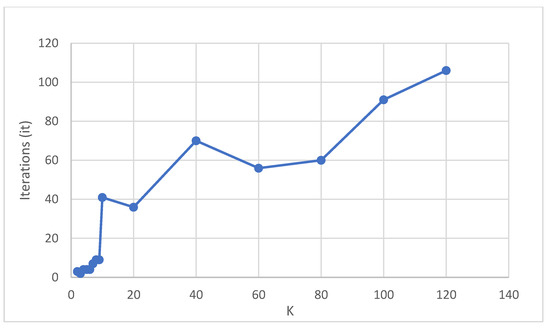 Some preliminary runs were devoted to studying the K value of K-means, which can minimize the SSD cost (sum of squared distances objective function—see Section 2). Figure 9 depicts the so-called “Elbow” curve, i.e., the SSD vs.K, which is often used to understand the values of K to adopt, and Figure 10 shows the number of emerged iterations required for convergence, i.e., it vs.K. The execution performance was then investigated by varying the K value from 10 to 120, as shown in Table 2.