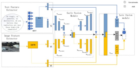 With the development of social networks, the speed of information dissemination is increasing rapidly, which not only facilitates people to socialize but also facilitates the spread of false information [,]. False information seriously damages the credibility of the media, infringes the public’s right to know, hinders the public’s right to participate and supervise, and in severe cases can disrupt social order, cause people’s property damage, cause public panic, disrupt social order and have serious adverse effects on society. For example, in 2011, the rumor that iodized salt would prevent nuclear radiation caused by the Fukushima nuclear accident in Japan caused everyone to frantically buy salt, which not only caused a waste of resources but also disturbed social stability. Therefore, how to detect false information at an early stage has become a recent research hotspot. Early information is in the form of plain text, so the early methods mainly detect false information by extracting text features from text content or extracting corresponding single-modality features from other single-modality data [,]. With the development of social media, the form of information has changed from the form of plain text to the form of multimedia [,,]. Most of the existing information is in the form of multimedia. At the same time, research found that the fusion of features of different modalities can effectively improve the performance of the model. Therefore, the recent research in the field of false information detection is mainly based on multimodal methods. However, the existing multimodal methods have shortcomings. First, most of the existing multimodal methods use early fusion methods or late fusion methods. However, there are many limitations in using only one method to fuse multimodal information, and it is difficult to fully fuse the information of different modalities. Second, for text feature extraction, most of them rely on the concatenated output of bi-gated recurrent unit (Bi-GRU) at each time step. However, the feature extraction process lacks the participation of corresponding factual knowledge. Such methods have limited ability to understand named entities in the text, and thus, it is difficult to fully capture the clues at the semantic level of false information []. The extraction of image features mostly relies on VGG19 [] to obtain features. This method requires a large number of parameters and computing resources during training. The quality of features extracted by these two models is lower than that of some existing models. Finally, the problem of original information loss is not considered when performing information fusion between modalities.