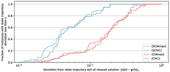 We conclude from Corollary 1 that the approximation and convergence results of the decomposition still hold if (SCIA), , is used to construct the binary control. The approximation bound based on (SCIA) is tighter than the existing (CIA)-related bound. Hence, it is an obvious choice to consult these alternative binary controls for an approximation study. Ideally, the binary control constructed in this way will result in an improved state approximation and objective value for (MIOCP). However, we oppose this hope next.