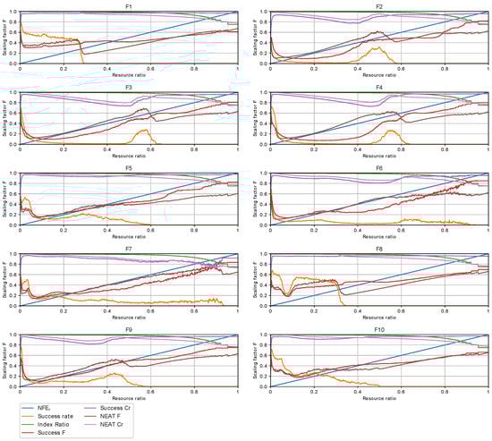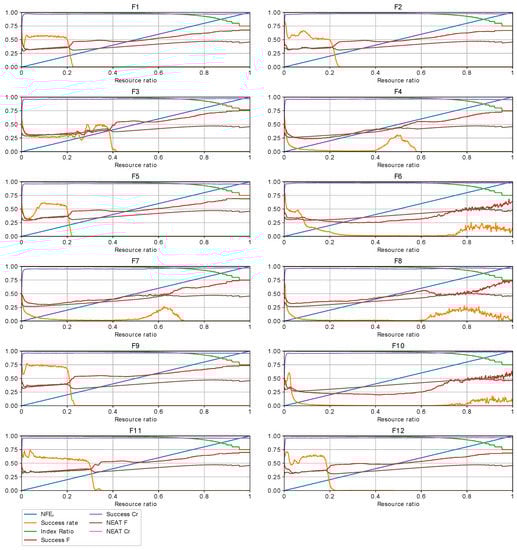 The evaluation of NEAT solutions was performed on a set of benchmark functions from the CEC 2022 competition on numerical optimization. The benchmark consists of 12 functions defined for 10-dimensional and 20-dimensional search spaces. To evaluate a single parameter adaptation heuristic designed by NEAT, 10 independent runs were performed for each of the 12 test functions in case. On each of the runs, the result consisted of the best reached function value and the computational resource spent to reach the goal, if it was reached. The CEC 2022 competition rules introduced the ranking of solutions based on both convergence speed and the best-found solution, where, between the two algorithms which found the solution, the one that did it faster was ranked higher. In order to take such a mechanism into account, the following evaluation metric was proposed: