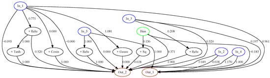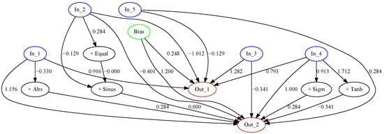 In the NEAT algorithm used in this study, several mutation operations could be applied to the same individual. The probabilities of mutation were set as shown in Table 1, in accordance with the values used in [55].
