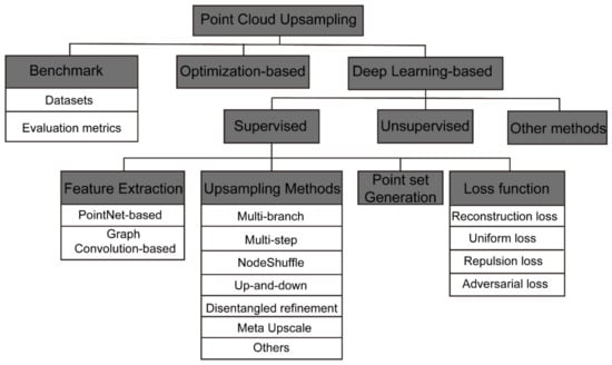 With the introduction of network models such as PointNet [6], PointNet++ [27], and DGCNN [28], irregular point clouds can be directly used for training. To benefit from this approach, the application of deep learning to point clouds has gradually become a popular research topic, and point cloud upsampling models with deep learning have also achieved a variety of results. Deep learning-based point cloud upsampling can be divided into supervised point cloud upsampling and unsupervised point cloud upsampling.