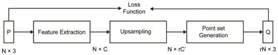 Supervised point cloud upsampling is trained with both low-resolution point clouds and corresponding high-resolution point clouds. Although these models are very different, they are essentially composed of individual components, such as a feature extraction component, an upsampling component, a point set generation component, and a loss function. A schematic diagram of the network model is shown in Figure 2.