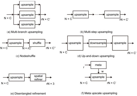 - Network structure. (a) Feature extraction: This is a meaningful research direction to provide different scales of information for the upsampling component by improving the feature extraction component. (b) Upsampling component: At present, there are different forms of upsampling methods, and determining how to perform effective and efficient upsampling remains to be studied. (c) Coordinate reconstruction: The existing coordinate reconstruction method is relatively simple, and a significant amount of research should focus on exploration to improve the coordinate reconstruction method. (d) Optimizing the model structure: People are currently pursuing the model’s performance more than paying attention to the size and calculation time of the model. Reducing the model size and speeding up the prediction while maintaining performance remains a problem.