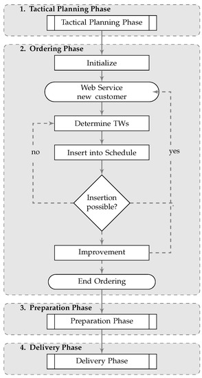 When customers place their orders, the company must first decide if the order can be accepted, and, if the order is accepted, integrate the order into the delivery schedule. However, the naive approach of solving a new VRPTW instance from scratch for each new order is far from being applicable in an online environment, even when using comparatively fast meta-heuristics. An up-to-date taxonomic review of meta-heuristics for the most common variants of the vehicle routing problem can be found in Elshaer and Awad [34]. To efficiently deal with the ordering process, we propose to split the computations during the ordering phase into the following four steps (summarized in Figure 1).