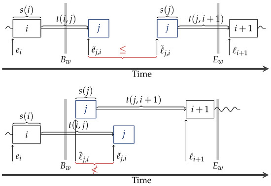 Figure 4 illustrates the values and for a tour with non-overlapping time windows. Clearly, if , then a violation of TFEAS() for j can only be repaired by removing (exchanging) customers that are inside u.
