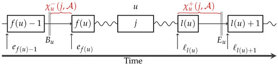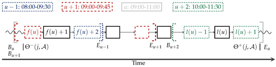 In Figure 3, we illustrate the definitions that have been introduced so far. We display the position of the first and last customers of u in case of overlapping time windows. Moreover, we indicate the positions of the insertion points and (vertical lines). In the given example, we notice that and differ as also the insertion of j after customer must be considered. Furthermore, we observe that customer is inside u although being assigned to time window .