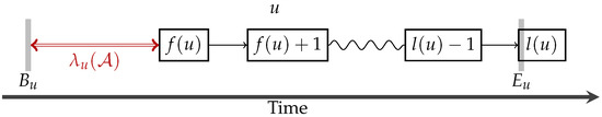 where is the length of u and is the amount of service and travel time that must be handled within u. In case that the indices and are not defined, i.e., , term is set to 0. In Figure 5, we provide an illustration of the free time.