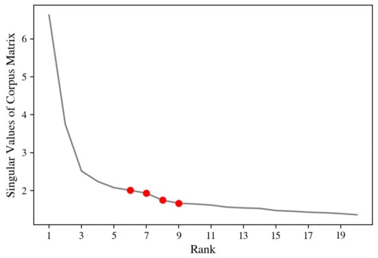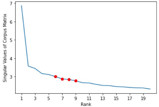 For our topic modeling methods, we need to preset the potential number of topics, which corresponds to the rank of corpus matrix . To determine the proper range of the number of topics, we analyze the singular values of . The magnitudes of singular values are positively related to the increment in proportion variance explained by adding on more topics, or increasing rank, to split the corpus matrix [30]. In this way, we use the number of singular values to approximate the rank of . Figure 1 plots the magnitudes of the singular values of corpus matrix against the number of singular values, which is also the approximated rank. By examining this plot, we see that a range for potential rank is between 6 to 9, since the magnitudes of the singular values start to level off around this range.