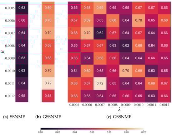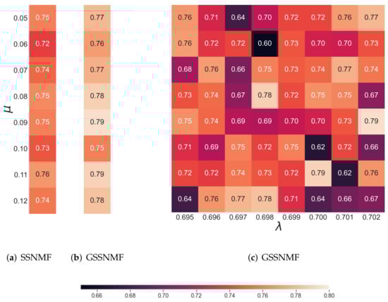 The heatmap representation of Macro F1-score averaged over 10 independent trials with : (a) displays the results for SSNMF with ; (b) highlights the best scores for GSSNMF by ranging from to ; (c) shows the performance of GSSNMF with different values of and in the predefined range. From the heatmap, one can see, for different , that one may choose such that GSSNMF outperforms SSNMF.
