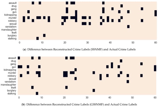 Difference between Reconstructed Labels using SSNMF and GSSNMF and Actual Crime Label matrices (), a light pixel indicates correct label assignment, while a dark pixel indicates otherwise.