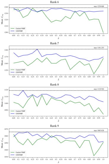 As suggested by Figure 1, a proper rank falls between 6 and 9. Starting with the generation of 6 topics from the AOB dataset, we first find a range of in which Guided NMF generates the highest mean over 10 independent trials. In our computations, we use the top 30 keywords of each topic to generate each coherence score; then, for each trial, we obtain an individual , allowing us to average the 10 from the 10 trials into the mean . Based on the proper range of , we then choose a range of for our GSSNMF to incorporate the label information into topic generation. Again, for each pair of , we run 10 independent trials of GSSNMF and calculate for each trial to generate a mean . With these ranges in mind, we work towards the following goal: for a given “best" of Guided NMF, we improve topic generation performance by implementing GSSNMF with a “best” that balances how much weight GSSNMF should place on the new information of predetermined labels for each document. We then repeat the same process for ranks 7, 8, and 9, and plot the mean against each in Figure 4. The corresponding choice of can be found in Appendix B. We can see that, most of the time, for a given , we are able to find such that GSSNMF can generate a higher mean than Guided NMF in topic modeling across various ranks. Ultimately, we also see that a GSSNMF result always outperforms even the highest-performing Guided NMF result.