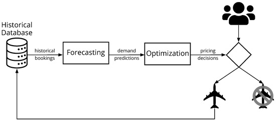The optimization of pricing decisions is usually delegated to a specialized revenue management system (RMS). The RMS first calibrates, from historical booking data, the parameters of a demand model that forecasts how future demand will answer to prices, then the forecast is used to optimize the pricing policy that indicates how to vary prices according to the airline’s current inventory capacity. Only the booking decisions made by customers are stored in a fixed-size historical database for future use (no-booking decisions cannot be captured by airlines), and the oldest records are deleted (first-in, first-out). Figure 1 illustrates the process.