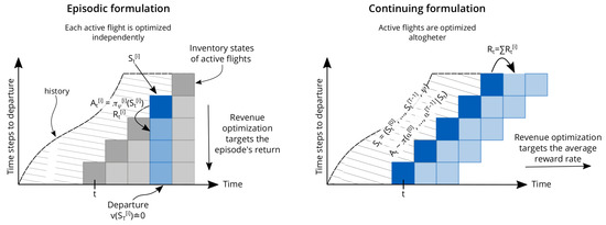 This work makes major contributions to how RL is applied to RM and to the EWL problem. RL is often seen as an online model-free alternative to RMSs that traditionally require a demand model [14,15,16]. The issue with such an approach is that data from real customers are not abundant enough to perform online training, and model-free RL methods are shown to be far less data efficient than model-based RMSs. Instead, we propose to use a sample model of the demand for offline training [10,17], thus focusing on the improvement of the pricing optimization only. Furthermore, we also call attention to the continuing nature of the EWL problem; balancing between earning and learning is a task that never finishes. In contrast to the optimization of the episodic revenue performed by RMSs (which maximizes the revenue of each flight, ignoring long term consequences of learning), we present an alternative modeling of the problem that maximizes the revenue of all concurrent flights in a combined way, allowing us to express the system’s revenue-maximization objective over an infinite horizon. Then, we demonstrate how to adapt RL to optimize the pricing policy for this new objective through the average reward.