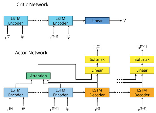 With regard to the modeling of the policy and the value functions in Algorithm 1, we suggest the use of artificial neural networks. We recognize that there may be many possible designs for the artificial neural network (ANN), and finding the best one is not the focus of our work. We find that the architecture illustrated in Figure 4, which uses a long short-term memory (LSTM) [54], the Luong-style attention mechanism [55] following the encoder–decoder architecture [56], delivers stable training and good performance results. Perhaps the most important aspect of our design is the use of the LSTM decoder in the actor network. The number of output units grows linearly with respect to the number of parallel active flights (i.e., for each active flight, the agent must compute the probability of selecting each fare in the fare structure), and it can quickly cause the ANN to have too many outputs to learn. By using an LSTM decoder, the ANN can share the learned parameters between the outputs of each active flight, allowing a more compact and efficient representation.