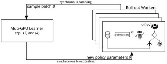 There are many classes of RL algorithms, but we focus on the important class of actor–critic methods. Generally, these methods seek to compute the stochastic policy function , also known as the actor, which returns the probability of selecting action a given state s, and the value function , also called the critic, which outputs the expected return from state s while following policy . In practice, the actor–critic methods usually model these two functions by the parameterized policy and parameterized value function . The main idea behind actor–critic is to perform updates for parameters to maximize the performance metric while following the policy gradient in a stochastic gradient ascent manner: