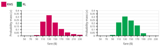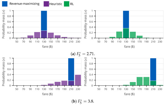 For the second analysis, in Figure 10, we display the RMS and the RL agent pricing policies when the true arrival rate and price sensitivity are fixed at and . We choose this point because the flights’ average load factor is 70%, which brings a natural price variability and a high amount of booking data to estimate the demand model parameters (the historical data contains an average of 1078 bookings). Given these two properties, obtaining a good estimation of the demand model parameters is relatively easy for the RMS, which puts in question the value of price experimentation. The RMS achieves a normalized revenue performance of 80.6%, with an MSE for a price sensitivity and an arrival rate of 0.007 and 0.20, respectively. The agent is better for revenue maximization, with a normalized revenue performance of 89.9%, but it has a worse model quality with an MSE for a price sensitivity and an arrival rate of 0.008 and 0.26, respectively. When comparing the two policies, we see that the major difference is that the agent prefers to price center fares $130, $150, and $170 more frequently (72.1%) than the RMS (65.3%). This strategy has a negative impact on the overall model quality, because it decreases the price variability in the historical data, but it turns out that center fares are better for revenue maximization than higher fares such as $210 and $230, because they are a less extreme given the true demand behavior. This aligns with our intuition that the RL agent tends to prefer “safer prices” when “price experimentation” is less suitable.