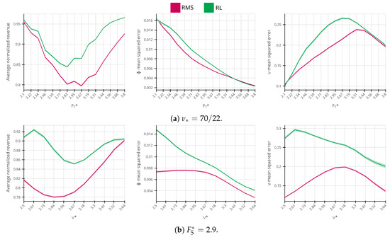 In Figure 7, we set the true frat5 parameter to the fixed values of the evaluation interval, and, for each frat5, we compute the average revenue performance and the price sensitivity MSE for 3565 independent evaluation runs. For the heuristic method, we choose a constant value for the trade-off parameter (see Equation (1)), which is the value that maximizes the expected revenue for the evaluation interval. In Figure 7 (left), we observe that RL outperforms both RMS and the heuristic method in the entire interval, except for . The reason why RL does not perform as well as the heuristic method for will be explained in the second experiment of this section, when we illustrate the final policy obtained for both methods. In Figure 7 (right), we plot the MSE over the estimation of the price sensitivity. We see that all methods have larger values for price sensitivity MSE for lower values of frat5, which decreases as the frat5 increases. The same effect is observed and explained in [33]. In short, this is because the true arrival rate parameter is known by the system. As the frat5 increases, so does the optimal fare, and the higher the selected price is, the more information is obtained about the customers’ price sensitivity. Moreover, we see that RL also produces lower price sensitivity MSE than the RMS and the heuristic method. The RL agent pricing policy displays a better estimation of the demand price sensitivity, and it also generates more revenue on average than the heuristic method and RMS.