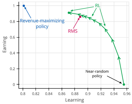 RL trajectory in the earning–learning space. The earning axis represents the average normalized revenue for the evaluation interval, while the learning axis represents the average estimated demand parameter’s accuracy . The revenue-maximizing policy is obtained by providing the true demand behavior parameters to the optimizer while keeping the estimation of parameters of the demand model as usual. The balance found by the revenue-maximizing policy is unstable, thus not being an answer to the problem.