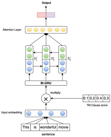 In this paper, we train TM on two movie review datasets and leverage the clause score of TM for each word in the vocabulary. We then use this prerequisite information of each word as initial information for the input layer in the neural network. We use Bidirection Gated Recurrent Unit (Bi-GRU) [24] for language representation for neural networks and Glove [25] to initialize the word embedding. In addition to this, we multiply the input embedding layer with prerequisite information of each word from TM. This makes the attention layer on top of Bi-GRU focus on important words.
