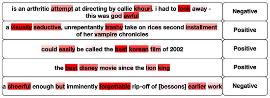 Visualization of attention weights with Bi-GRU only. Dark red to light red color represents the color gradients based on the attention weights in descending order.