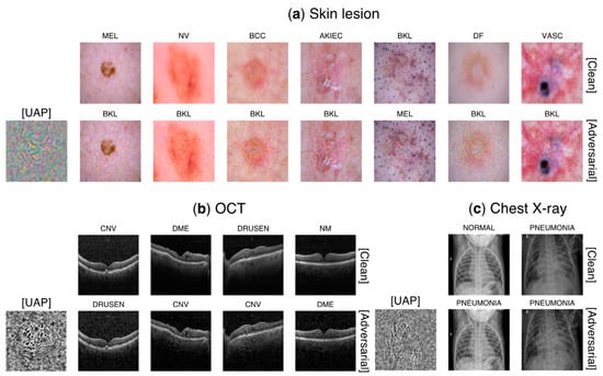 Clean images and their adversarial images generated using nontargeted UAPs against Inception V3 model, which has been widely used in previous studies on DNN-based medical imaging (e.g., [,]) for (a) skin lesion, (b) OCT, and (c) chest X-ray image classifications. Here, in (a,c) in (b) in terms of the UAP performance (Table 1). Labels (without square brackets) next to the images are the predicted classes (see Table S1 for details). Each UAP is scaled by a maximum of 1 and a minimum of zero to visually emphasize UAPs.