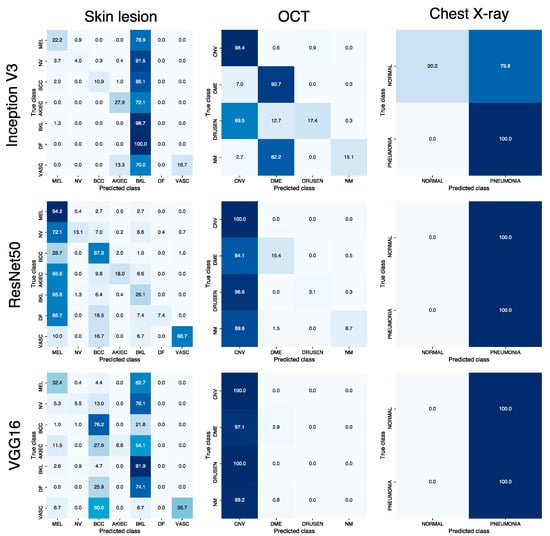 Normalized confusion matrices for Inception V3, ResNet50, and VGG16 models attacked using nontargeted UAPs for skin lesions, OCT, and chest X-ray image datasets. Here, for skin lesion and chest X-ray image datasets, and for the OCT image dataset. See Table S1 for the abbreviations of the class labels.