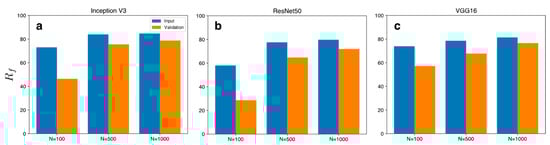 As shown in Figure 3, increases with . In addition, for the validation dataset was lower than that for the input dataset; however, the difference in between the validation dataset and input dataset decreased with an increase in . These tendencies were observed regardless of the model architecture. The results indicate that UAPs achieve high performance and generalization, resulting in a misclassification of the DNN model with an increasing in . However, the UAPs showed a relatively high performance despite a small . When , for the validation dataset was >50% for the Inception V3 and VGG models, although it was ~30% for the ResNet50 model. Moreover, for the validation dataset was >60%, regardless of the model architecture, when .