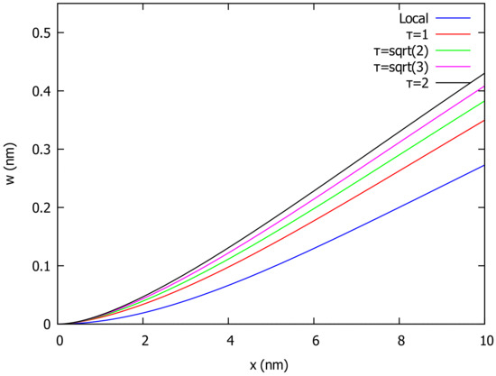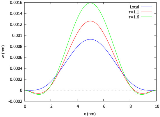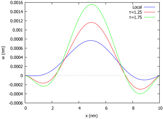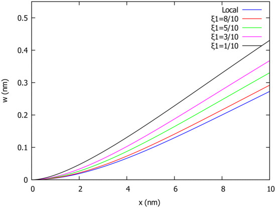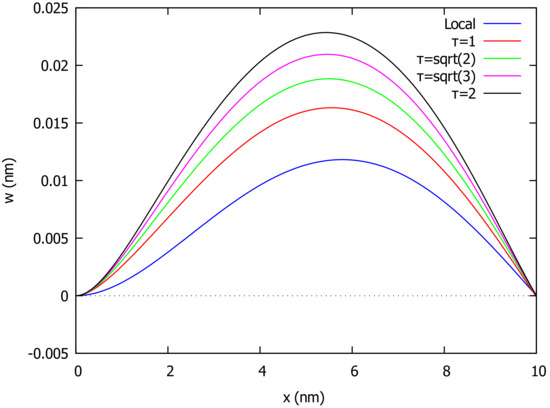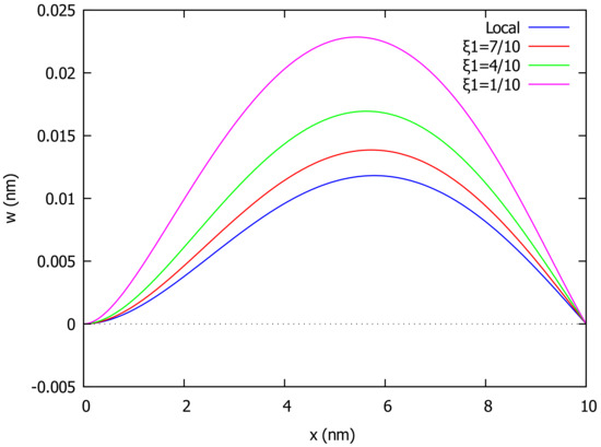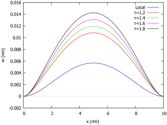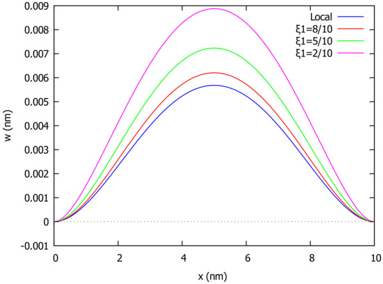 where n is a positive integer. For the case of uniformly distributed load , the deflection throughout the beam according to local () and nonlocal () elasticity for various values of the nonlocal parameter is depicted in Figure 1. Figure 2 shows the deflection for and several values of the parameter that controls the influence of local and nonlocal integral models in the constitutive relation. In the case of a variable distributed load with , the deflection is sketched in Figure 3 for different values of the nonlocal parameter .