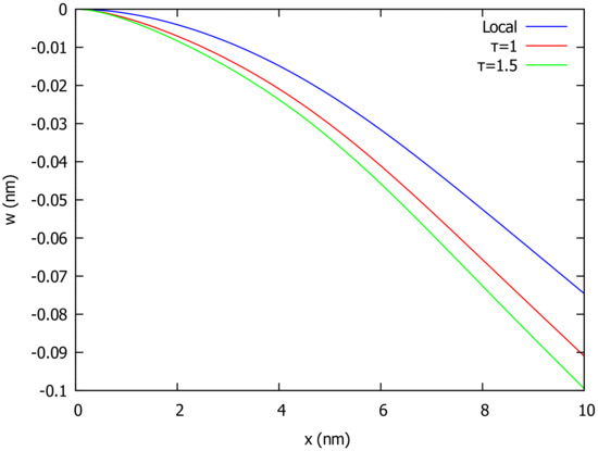 As a third example, we take the case of a clamped beam (CC) for which the boundary conditions are given in (42). In the case of a uniformly distributed load, the deflection across the beam in both local () and nonlocal () theory for different values of is given in Figure 7, while Figure 8 shows how the deflection changes as varies. In the case of the above variable distributed load with , the beam deforms as shown in Figure 9 in a local () and nonlocal () model for different values of the nonlocal parameter .