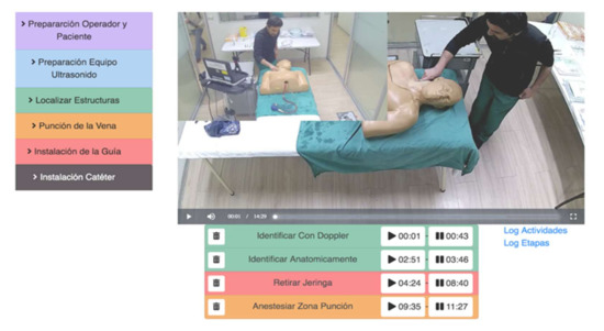 Event logs generated from the video tagged dataset are comma-separated value (CSV) files that contain a row for every tagged video event. Consequently, an event log will be generated with the following information: case ID, resource ID, round type (POST and PRE), event ID, activity ID, stage, and the start and end time of the activity. Contrary to more conventional process mining datasets, event logs are not generated autonomously, but rather from observations of process execution. As an alternative, users used an observer-based approach to monitor student recordings through the use of special software video tags. An example of video tagging performed during CVC installation can be seen in Figure 2. Event logs are created by tagging PRE and POST training execution videos, which include 20 cases for 10 different students (resources), and 29 different activities. These events occurred between 11 October 2018 and 20 January 2019. The timestamp is recorded as a date (MM: DD: YYYY) and time (HH: MM: SS).