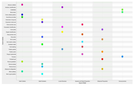 In the CVC installation process, there are six stages (operation and patient preparation, ultrasound preparation, locating structures, inserting guidewire, and inserting catheter), and each stage involves 29 steps. Color coding of these activities is shown in Figure 3 during POST and PRE training.