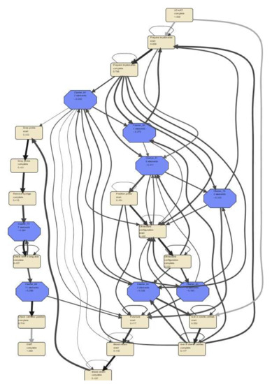 Fuzzy mining presents process models as process graphs that limit the activity items displayed in an aggregated manner. We used the ‘ProM Mine for Fuzzy Model’ algorithm to mine the activity interaction process between ten student groups to investigate the coherence between operational activities. Use a node edge filter with a cut-off of 40% significance to display the highly correlated activities. Approximately 40% of significant behavior appears as bright square activities in Figure 4. The less significant activities but with high correlation are hidden clusters that are represented by dark blue octagonal nodes. All relevant activities are grouped into clusters with their aggregate significance displayed. By obscuring less important activities, fuzzy process models enable medical experts to focus on the common features of a process. In general, darker edges indicate more significant relationships.