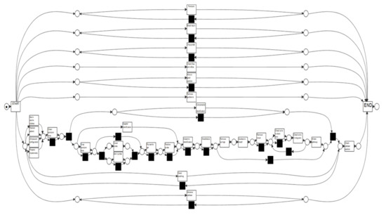 A threshold value of 20% was used to ensure low model noise, which is less than our previous work [32]. The P-net outcome model (circles and boxes present the places and transitions) generated with inductive mining is presented in Figure 5. Black boxes are anonymous transactions to ensure the soundness of the model, while white boxes represent operational activities. In the patient preparation stage, the P-net model began with three parallel activities (get sterile cloths in, prepare implants, wash hands). It means that students can typically choose all three activities at this stage since there is no priority among these activities, and then follow two other sequential events (clean and drap puncture area).