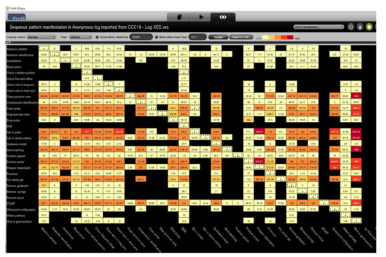 With Petri-net alignments, we can also visualize the average time delay between activities. Figure 7 shows that the transition from gel in the probe to wire in a suitable position takes a medical student the longest time—635 (3.53 h) minutes. Light-yellow boxes indicate the shorter delay, while dark red boxes indicate the longest. The next transition from probe position to implant preparation is to add 623 min (3.46 h) and gel to the probe to prepare implants in 550 min (3.05 h).