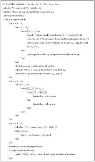 The dominating methods often applied for DOPs are the particle swarm optimization (PSO)-based algorithms and their modifications such as multi-swarm approaches [13,14], however, certain studies used Differential Evolution (DE) [15] or, for example, Artificial Bee Colony (ABC) algorithm [16]. Yet little has been done for the development of hybrid approaches, which would use the advantages of different methods. Thus, the goal of this study is to establish the ways in which DE can be added to PSO-based approaches, improving the resulting performance.