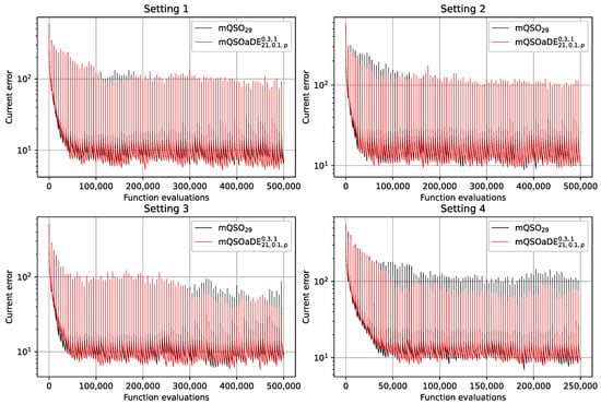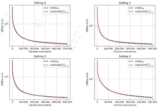 With the same population size, the mQSODE algorithms were able to significantly outperform the mQSO in the third setting, i.e., when the number of components is increased to 25. Comparing with , the always performs better, except for the fourth setting, although these improvements are not significant according to the Mann-Whitney test.