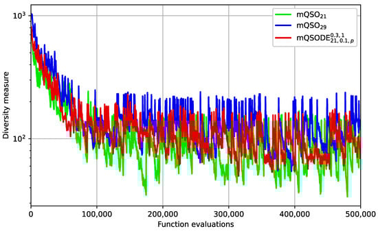 Analyzing Figure 2 and Figure 3 it can be noted that is more conservative at the beginning, i.e., during the first several environmental changes, while achieves better values. However, at the final environmental changes both current and offline errors of the modified algorithm are better, which indicates that it makes a better job tracking the local optima. To analyze the reasons for increased performance in the long term, the diversity measure was used for three algorithms, namely , and . The diversity was measured at every iteration as follows: