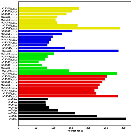 To compare the efficiency of all the tested modifications, the ranking procedure from the Friedman statistical test was applied, which will further be referred to as the Friedman ranking. To perform such a comparison, all algorithms’ results over 31 independent runs were ranked for every benchmark setting and every performance measure. After this, the ranks assigned to each algorithm participating in the comparison were summed together to form a single rank, which is depicted as a bar in a bar plot in Figure 5. Such a procedure allows for aggregating different performance measures and test scenarios in a single measure, highlighting the best approaches.
