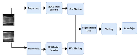 - The score level fusion method based on Bayesian optimized SVM score fusion (BSSF) and Bayesian optimized SVM based fusion (BSBF) is proposed. In the BSSF method, each finger vein instance is matched using SVM. The resulting score for each finger vein instance is then multiplied with a weight that is optimized using a Bayesian optimizer. The weighted scores are then summed and used to determine the decision of match or not match. In the BSBF method, each finger vein instance is matched using an Euclidean distance matcher. The resulting score for each finger vein instance is then normalized and concatenated as a score vector. The score vector is then fed into the SVM classifier for decision. BSSF should give better performance as compared to BSBF, since there is less information loss, by classifying the HOG feature with SVM. Meanwhile, BSBF classifies the score after Euclidean distance matching, which results in more information loss. However, BSSF requires access to the features from a biometric system, which is not always available in the biometric system. On the other hand, BSBF only requires access to the scores from a biometric system, which is usually available even in a proprietary biometric system; this gives BSBF wider compatibility as compared to BSSF.