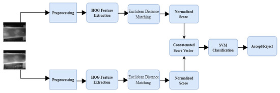In the second classification approach which is termed as SVM based fusion (BSBF), the HOG feature of different instances is matched using Euclidean distance to construct the normalized scores. For example, the resulting scores of the index and middle finger are concatenated as a score vector. The score vector is then fed into SVM for classification purposes. The overall framework of the proposed BSBF is presented in Figure 2.