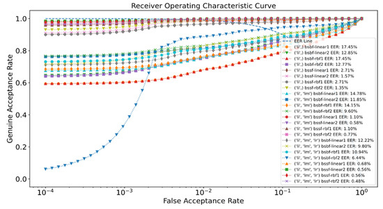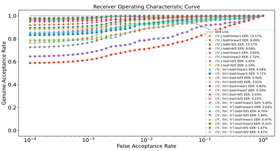 The EER for the UTFVP dataset is presented in Table 2. It can be observed that the performance of the proposed methods tested using different optimization settings for different finger vein combinations is presented. It can be observed that BSSF-linear2, in general, gives better results with the EER of 1.72% for the left index finger. The lowest EER that combines the left index, middle, and ring fingers is 0.31% for BSSF-linear2. Amongst the results, BSSF-rbf2 gives the best EER of 0.22% when using the left index and middle finger. Similar to Table 1, the BSSF method outperforms BSBF in terms of EER. The lowest EER achieved for the BSBF method is 1.84% by using the RBF kernel. To conclude, both the SDUMLA-HMT and UTFVP datasets are able to attain the best performance by using the BSSF approach with RBF kernel, with EERs as low as 0.48% and 0.22%, respectively.
