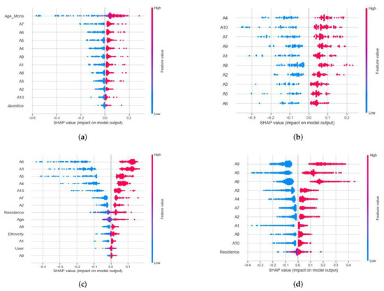 Analysis of Shapley values for (a) the toddler subset of the RIPPER method, (b) the adolescent subset of the Boruta algorithm, (c) the child subset of the CFS–Harmony Search method, and (d) the adult subset of the CFS method employing the best-performing SVM.