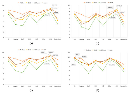 For toddler datasets, SVM represented their maximum result in all metrics except AUROC for . When we considered the value of AUROC, NB showed the best result for . Then, SVM also showed their highest outcomes for all metrics for and in child datasets. In addition, KS provided the best AUROC for and . In adolescent datasets, SVM showed the best accuracy, kappa statistics, and f1-score for . However, NB represented the top AUROC for . In adult datasets, SVM also produced the highest findings in all metrics for . Therefore, it was found that the RIPPER algorithm for toddler, the Boruta algorithm for adolescent, and the CFS method for child and adult datasets were responsible to generate high results in the classification process.