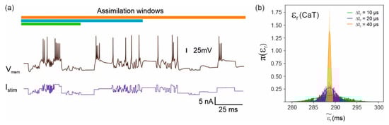 Measurement noise or intrinsic noise [75] may be smoothed {7,8] to improve parameter accuracy. Parameter accuracy may also be enhanced by increasing the duration of the assimilation window. In Figure 2, the effect of increasing the assimilation window is to narrow the posterior distribution function [11,76]. The assimilation window can be widened without increasing the size of the problem, using an adaptive mesh size. This works by selectively sampling action potentials at a faster rate than subthreshold oscillations across the assimilation window [11].