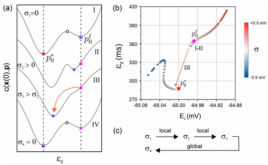 Regularization by noise. (a) The cost function plotted as a function of one parameter has local minimum in the vicinity of the global minimum . The parameter estimation algorithm started from an initial guess at the local minimum (pink star). Then, the amplitude of noise was increased. Until a critical value, the parameter solution remains in the local minimum but shifts (blue dot). Above this critical value, at , the local minima and the global minimum merge, causing an abrupt jump of the solution into the (noise shifted) global minimum. The global solution above then need to be inserted as input to the parameter estimation algorithm, and then, noise is progressively decreased to zero to obtain the global minimum at zero noise. (b) Trajectory of the neuron parameter vector projected in two dimensions as noise is varied. A jump is observed from the local to the global solution. (c) Schematics of the noise annealing protocol [11].